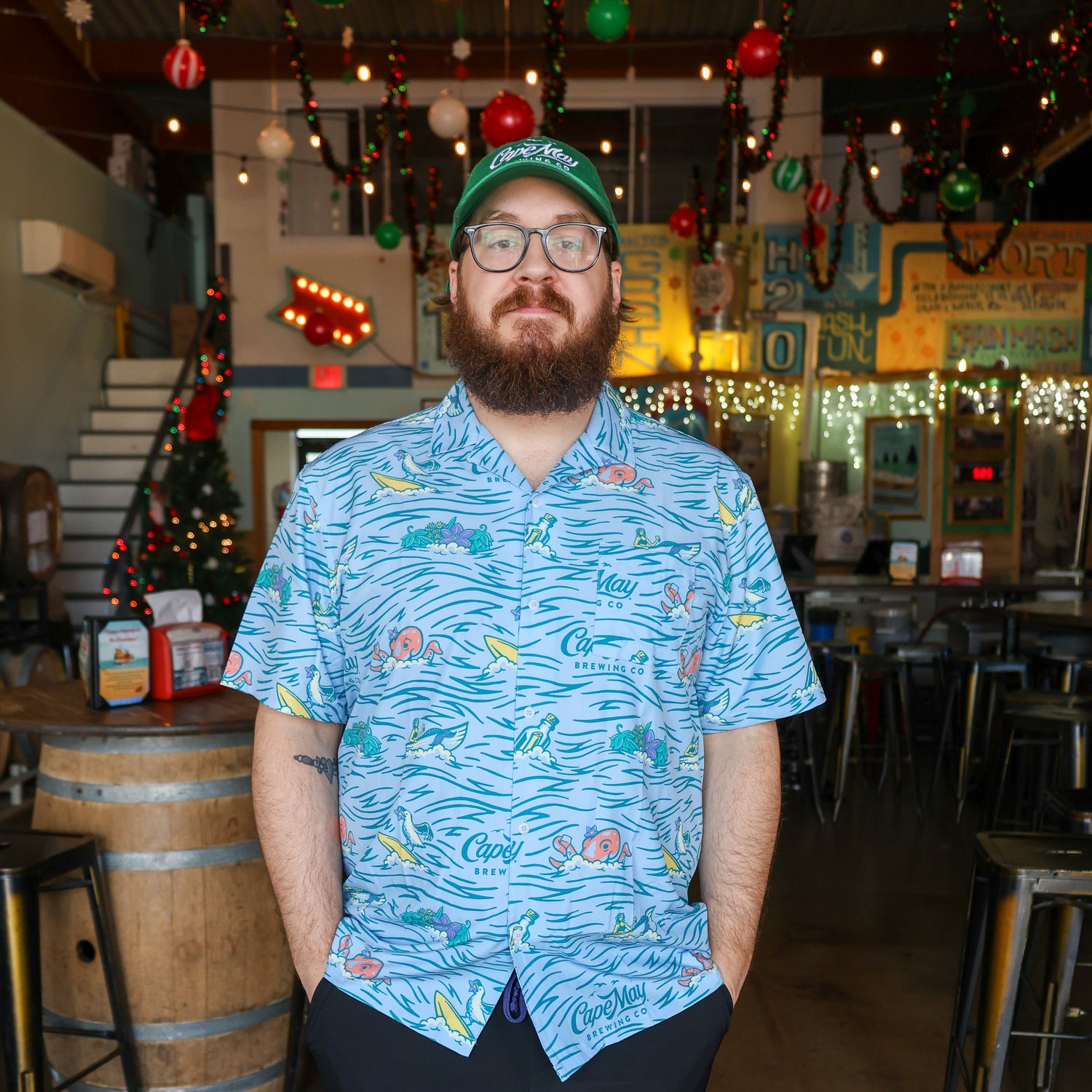 Designed with a retro vibe in mind, this vintage-fit short sleeve shirt features an all-over print bursting with Cape May Brewing Co. charm—think surfing seagulls, beer-loving octopuses, messages in bottles, mermaids, hops, and florals, all tied together with our signature logo. Made from a sustainable blend of 95% polyester and 5% spandex, this soft, breathable, and eco-friendly shirt offers stretch and comfort for sunny adventures at the shore or laid-back Floral Fridays."