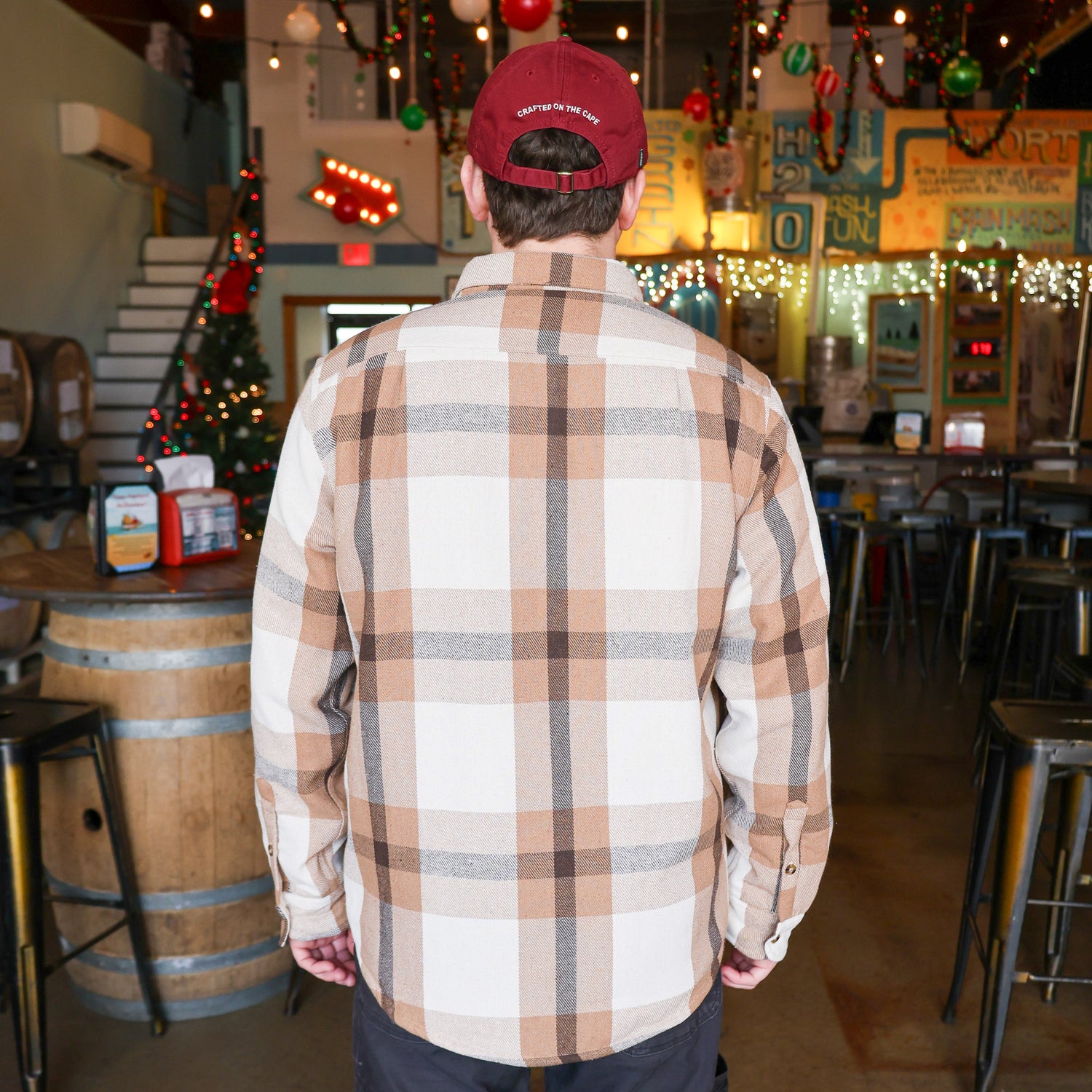 Made from a medium-weight flannel and fully lined with soft sherpa fleece, this button-down delivers serious warmth and classic style. The Khaki plaid pattern features neutral tones of tan, cream, and brown, paired with the Cape May Brewing Co. Windswept logo embroidered on the right chest, opposite the pocket. Whether you're layering up for chilly mornings or cool coastal nights, it’s a laid-back essential for any Cape May fan.